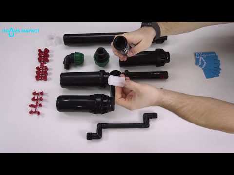 Роторный дождеватель, спринклер HUNTER бытовой серии SRM. Ороситель предназначен для установки в грунт, корпус изготовлен из прочного пластика, полимерная манжета надежно герметизирует выдвижной шток от протекания воды. Шестереночный механизм поворачивает головку дождевателя в секторе от 40 до 360 градусов, рабочий сектор регулируется специальным ключем для роторных дождевателей HUNTER или обычной отверткой. В нижней части выдвижного штока расположен фильтр, который при необходимости вынимается и промывается. Храповый механизм обеспечивает регулировку одной из сторон сектора полива, шток поворачивается рукой с усилием, другая сторона сектора устанавливается вращением регулировочного винта расположенного на головке штока.