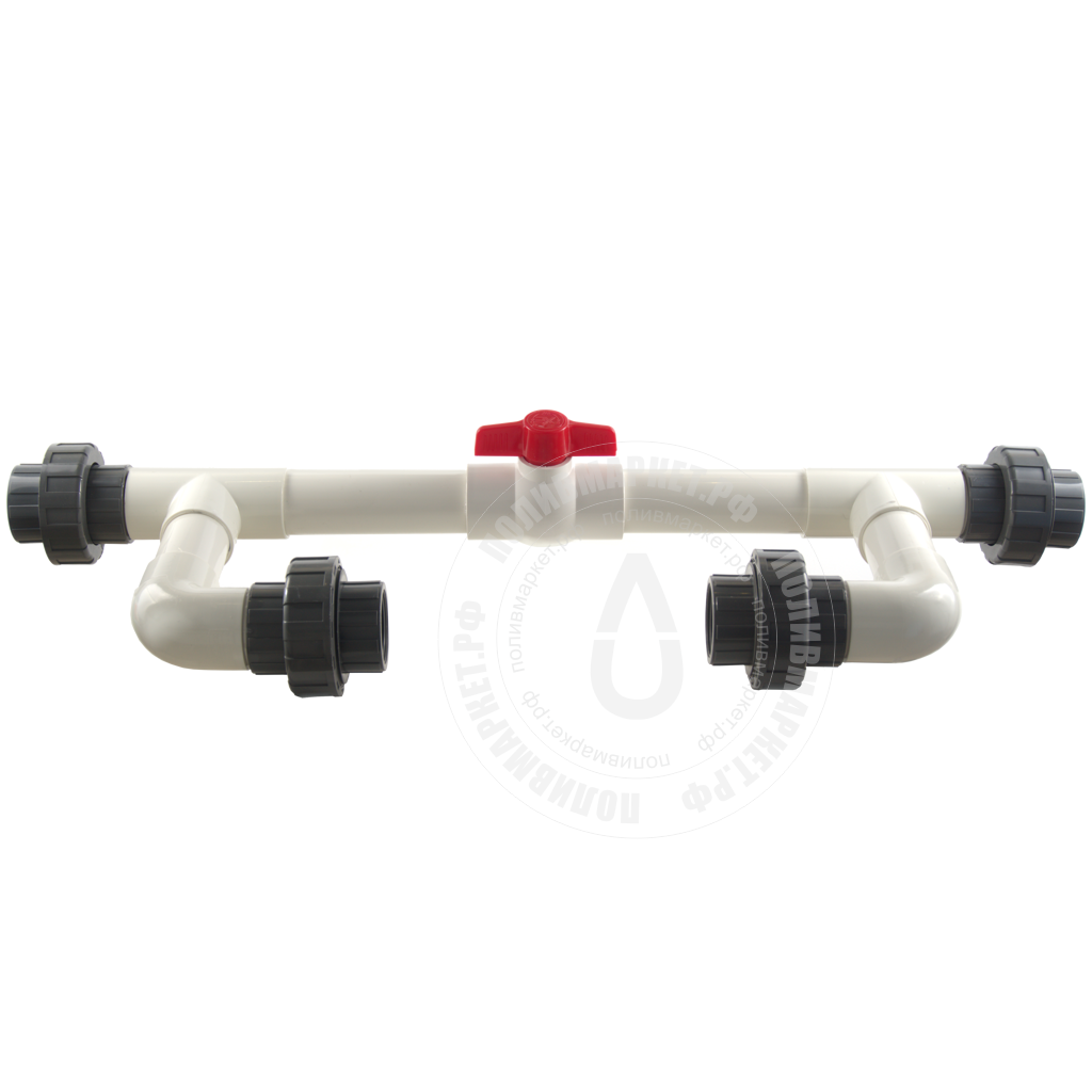 Обвязка позволяет без труда подключить инжектор Вентури системой байпас, а это значит что не произойдет потери в производительности, пропускная способность магистрали в которую установили инжектор не измениться. Кроме того, установленный на обвязке кран позволяет перераспределять поток воды между контурами, увеличивая или уменьшая скорость прохождения воды в самом инжекторе, тем самым регулируя скорость и объем всасывания удобрений. Все муфты установленные на обвязке разъемные (американка), позволяют без труда врезать обвязку в магистраль и легко установить инжектор на свое место.