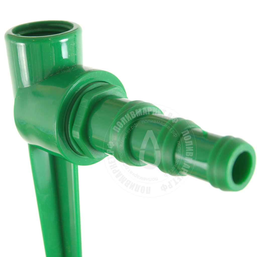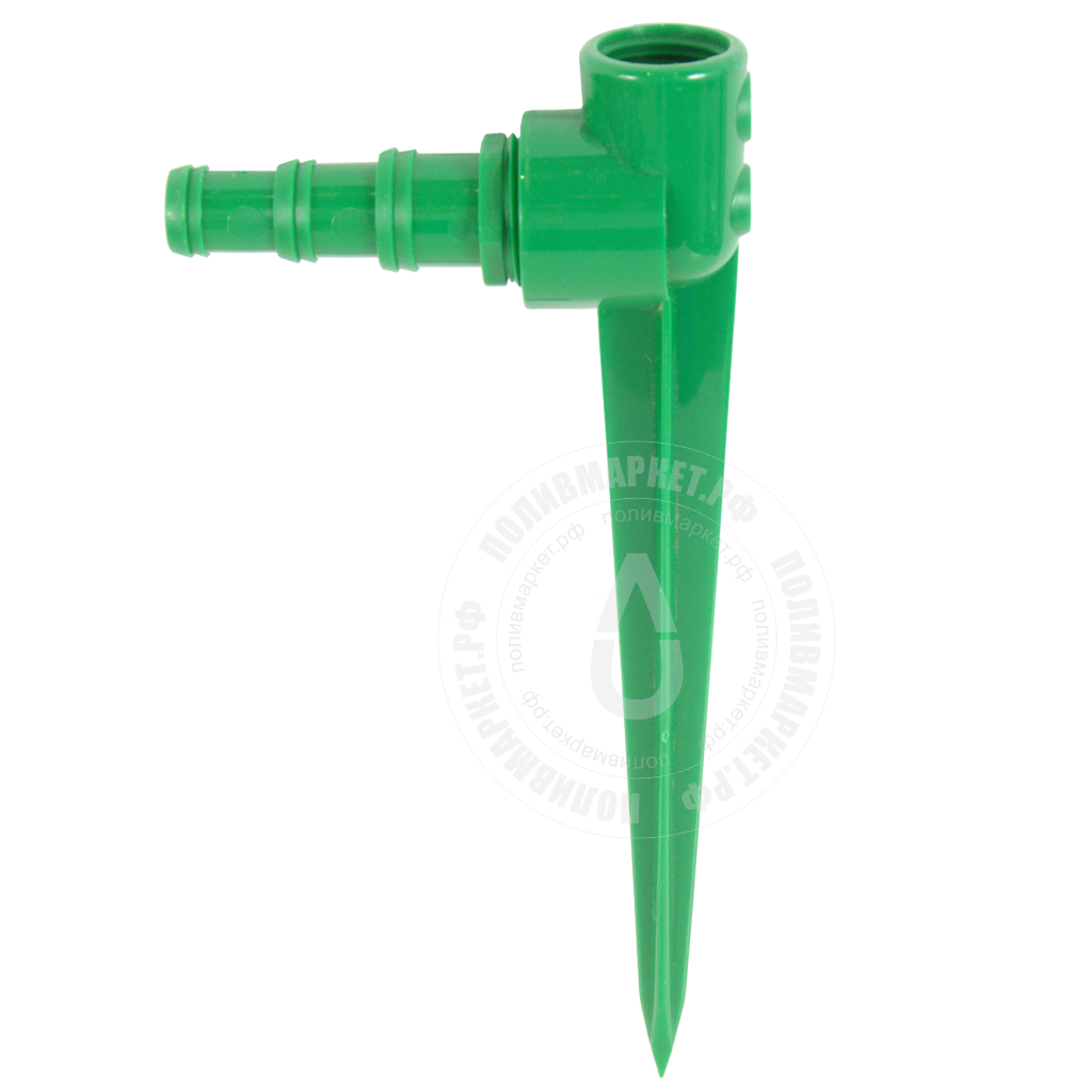 Колышек для подключения и установки оросителей. Запитывается от садового шланга, шланг закрепляется хомутом на штуцерном соединении.