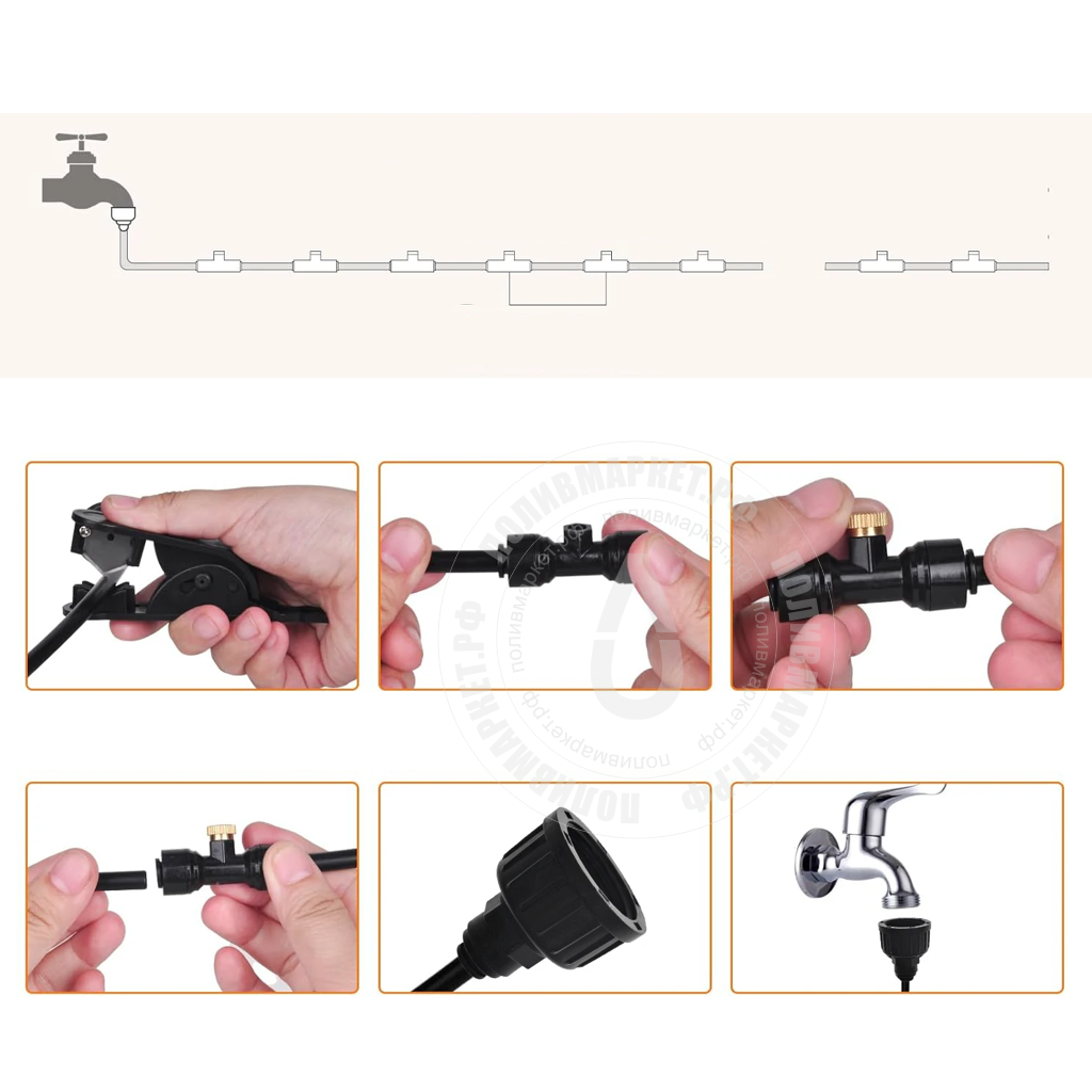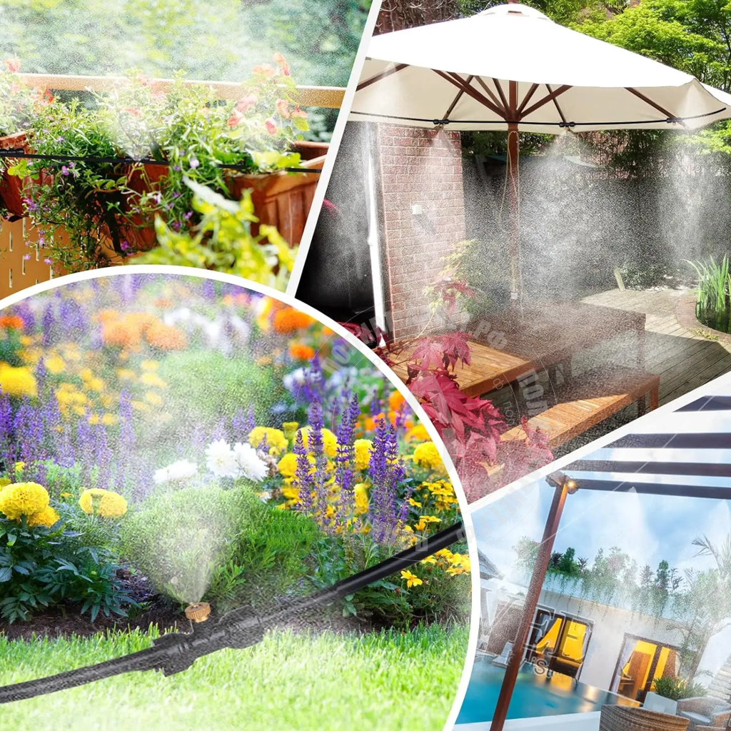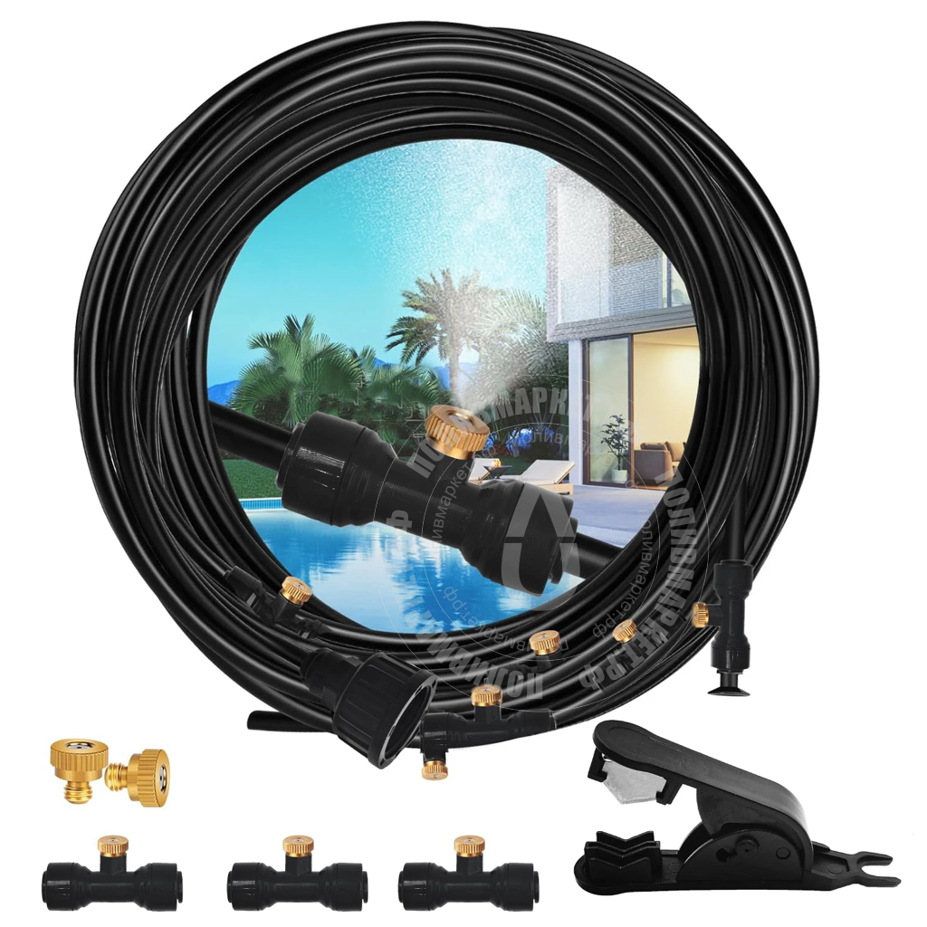 Комплект туманообразования предназначенная для: использования как на улице, так и внутри помещений, оранжерей или теплиц. Используется для охлаждения беседок, летних кафе, для контроля влажности в оранжереях или теплицах. Подключается к водопроводу с минимальный давлением 2,5 бар